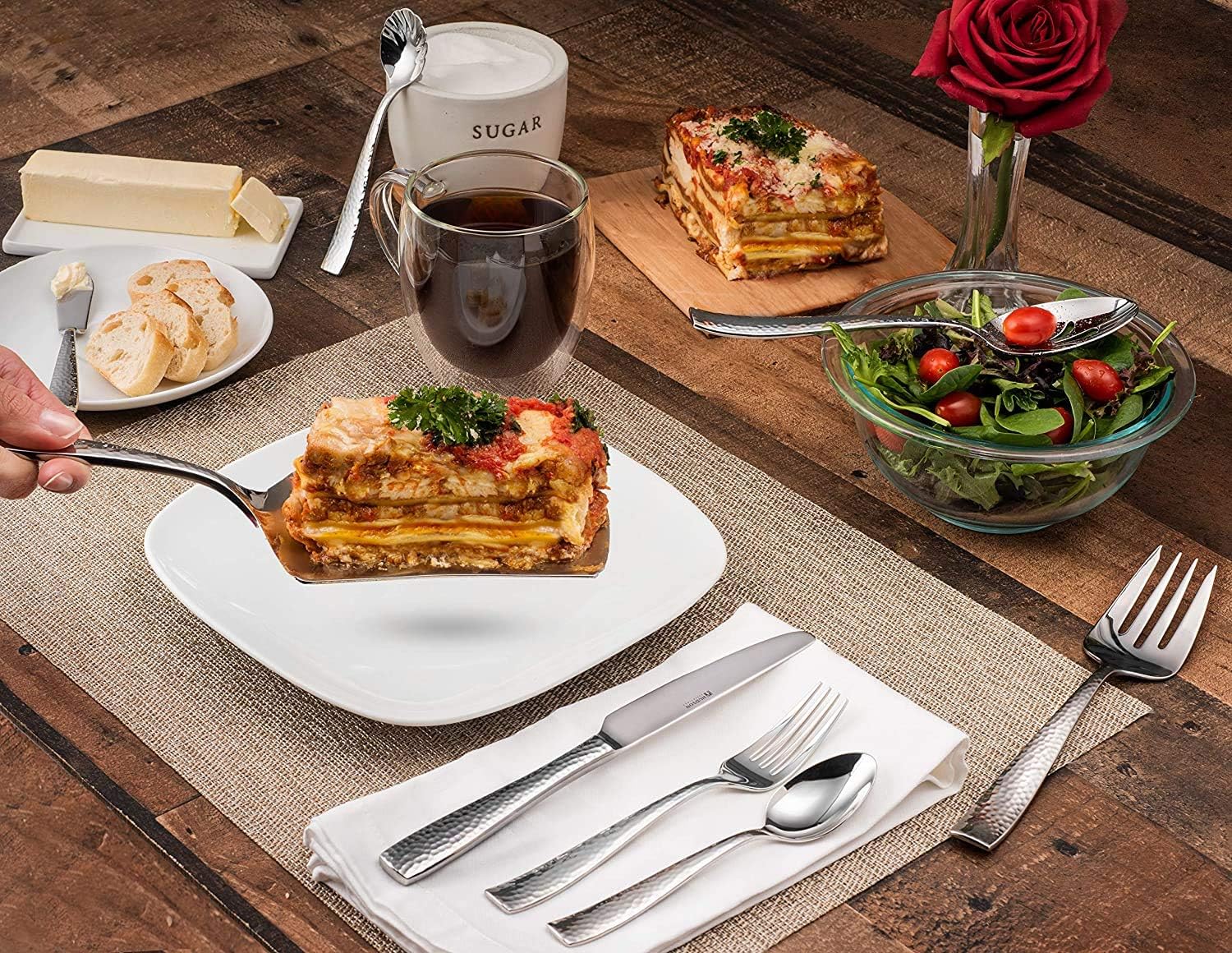 Introducing the Hudson Essentials 60-Piece Hammered 18/10 Stainless Steel Silverware Cutlery Set, a luxurious and elegant addition to your dining experience. This exquisite flatware set is designed to impress with its sleek and modern design, perfect for both everyday dining and special occasions.