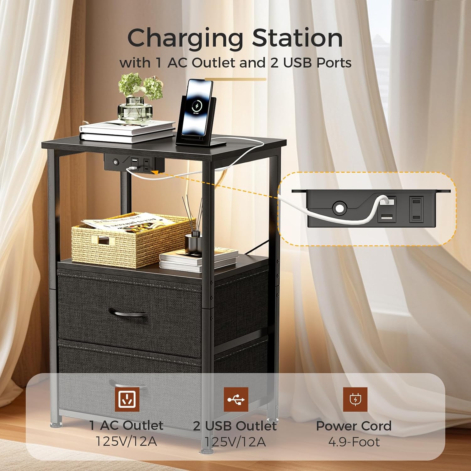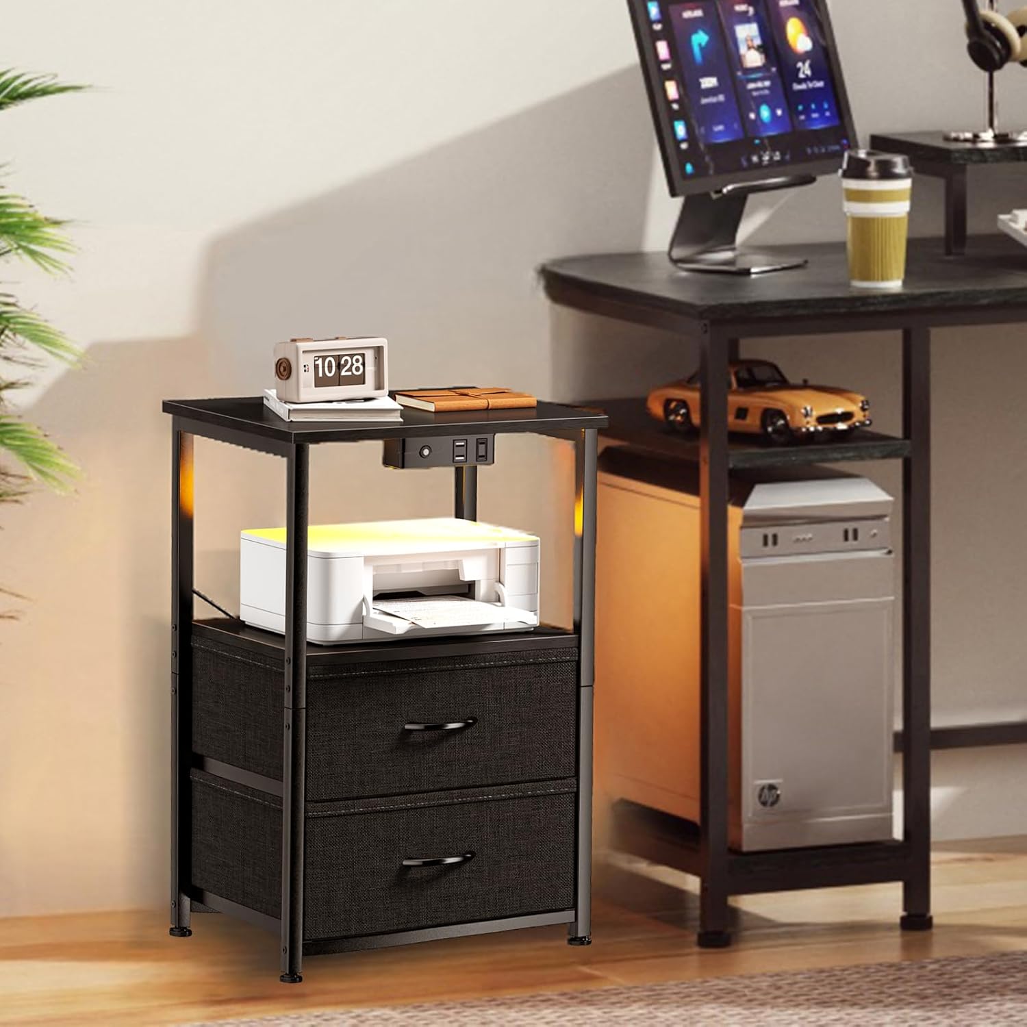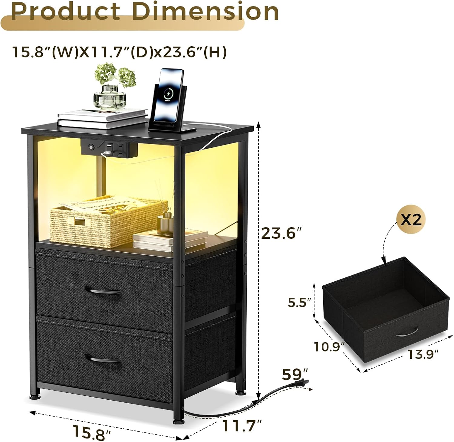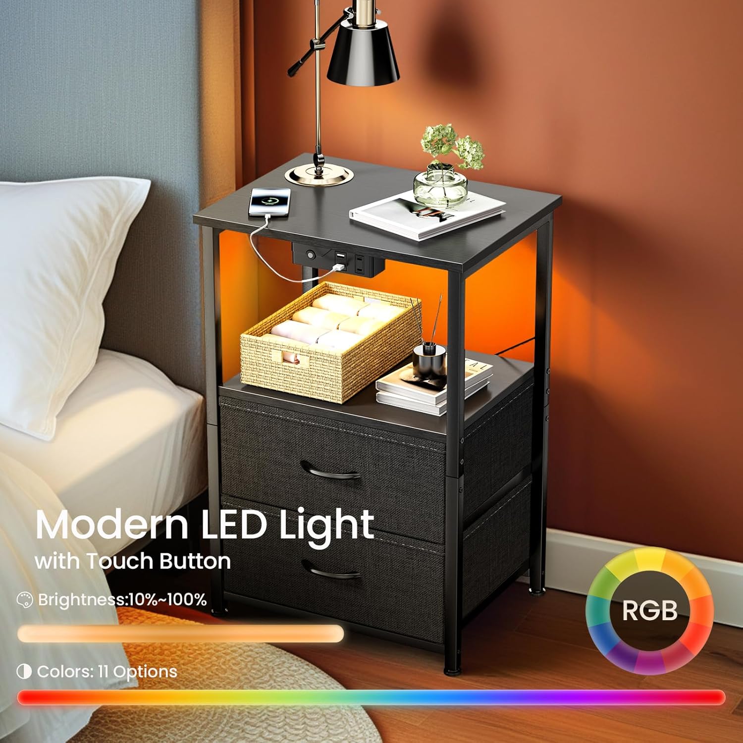 Introducing the stylish and practical Nightstand with Charging Station and LED Lights, the perfect addition to your bedroom decor. This Small Night Stand offers a sleek design with a fabric drawer and storage shelf for convenient organization. The integrated charging station allows you to easily power up your devices while you sleep, and the LED lights provide a soft and ambient glow for a cozy atmosphere.