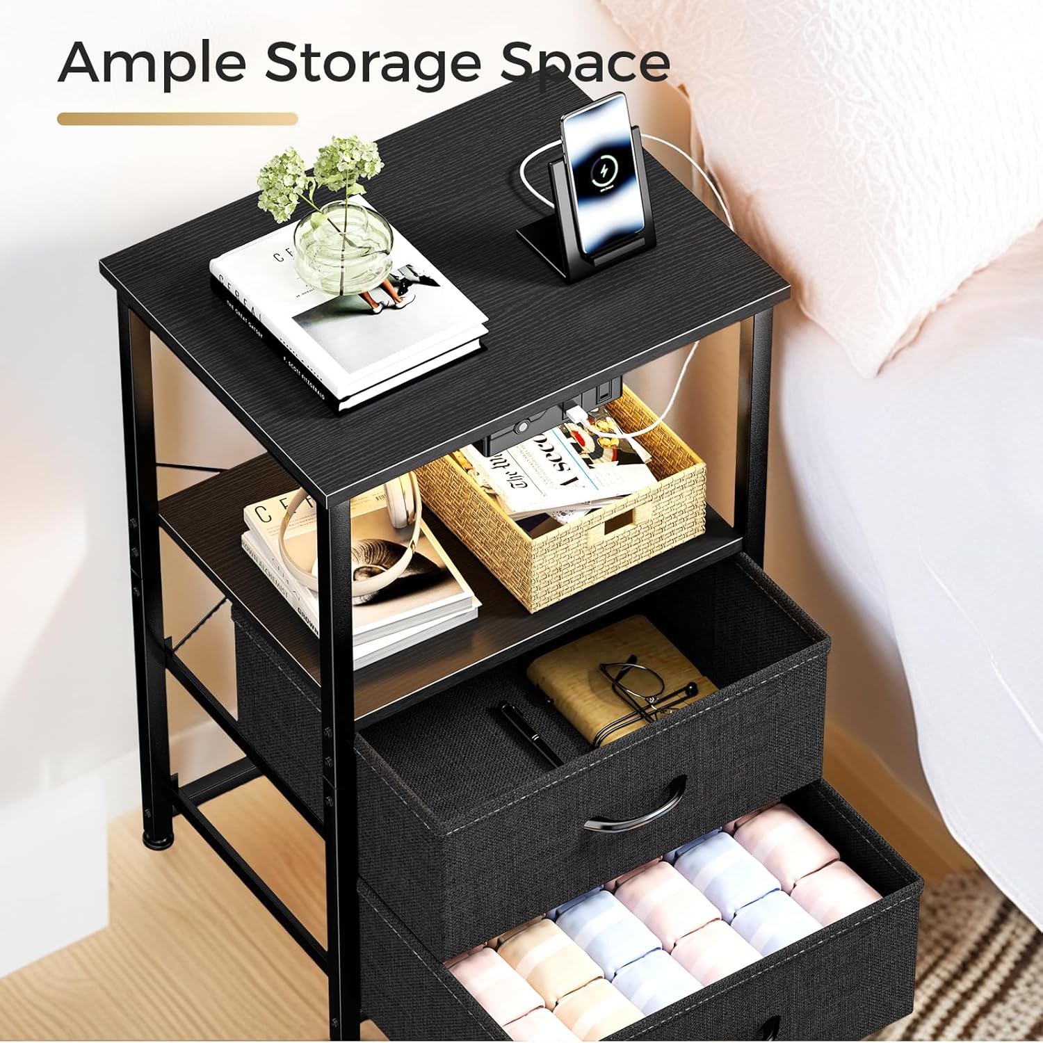 Nightstand with Charging Station and LED Lights, Small Night Stand for Bedroom with Fabric Drawer and Storage Shelf, End Table with Waterproof Top, Easy Assembly, Black